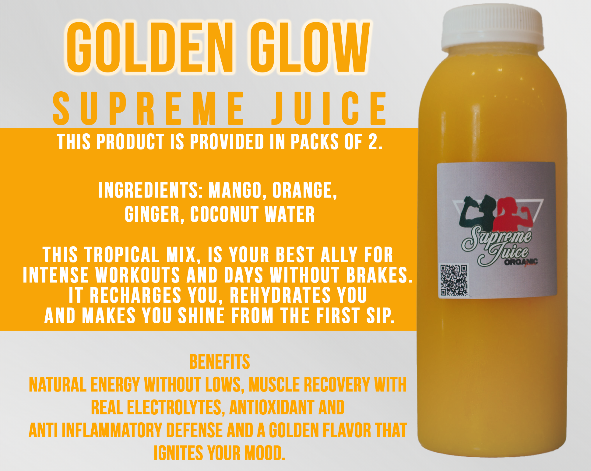 Natural Energy without lows, Muscle Recovery with real electrolytes, Antioxidant and anti inflammatory defense and a Golden flavor that ignites your mood.